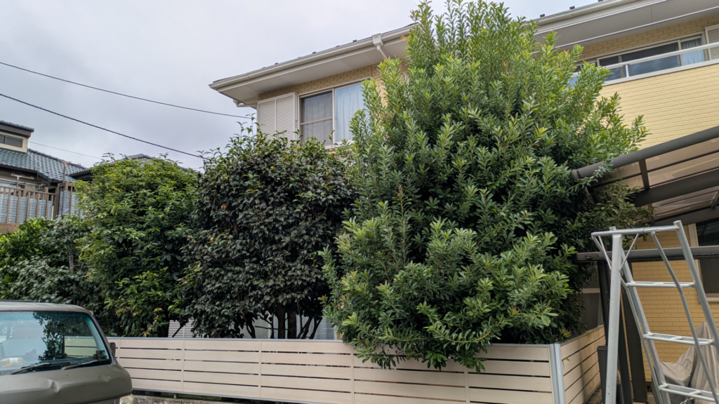 フェンスの角の庭木なのでスペースが限られるので作業が難航する可能性がある。