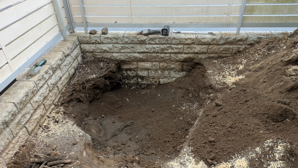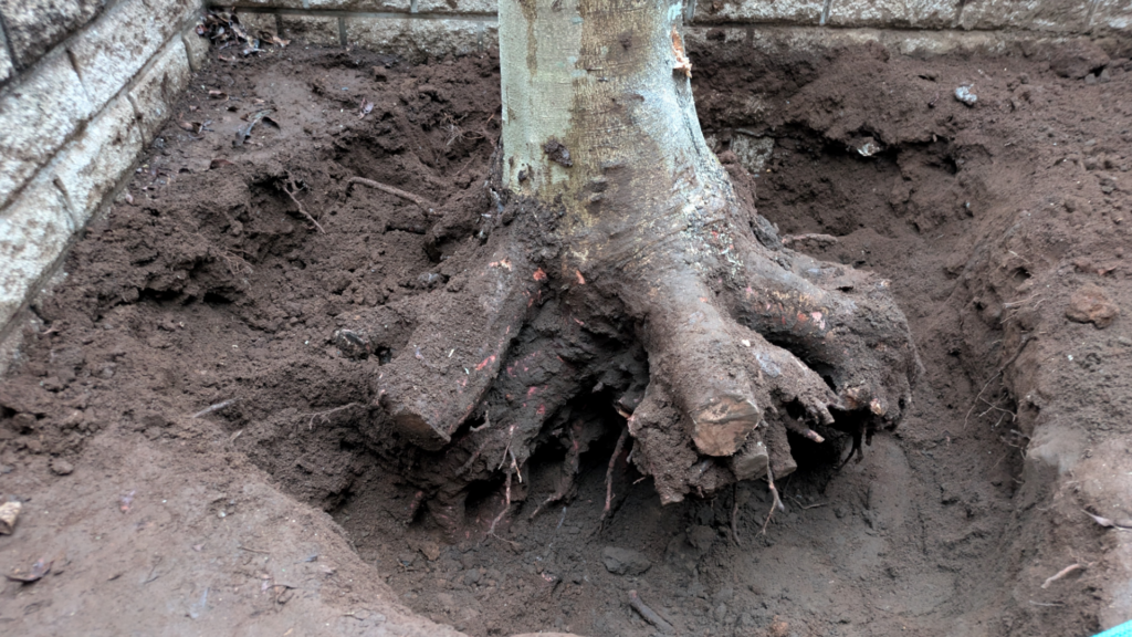 ひたすらスコップとバールで掘り、根を切りながら作業を進めていく。