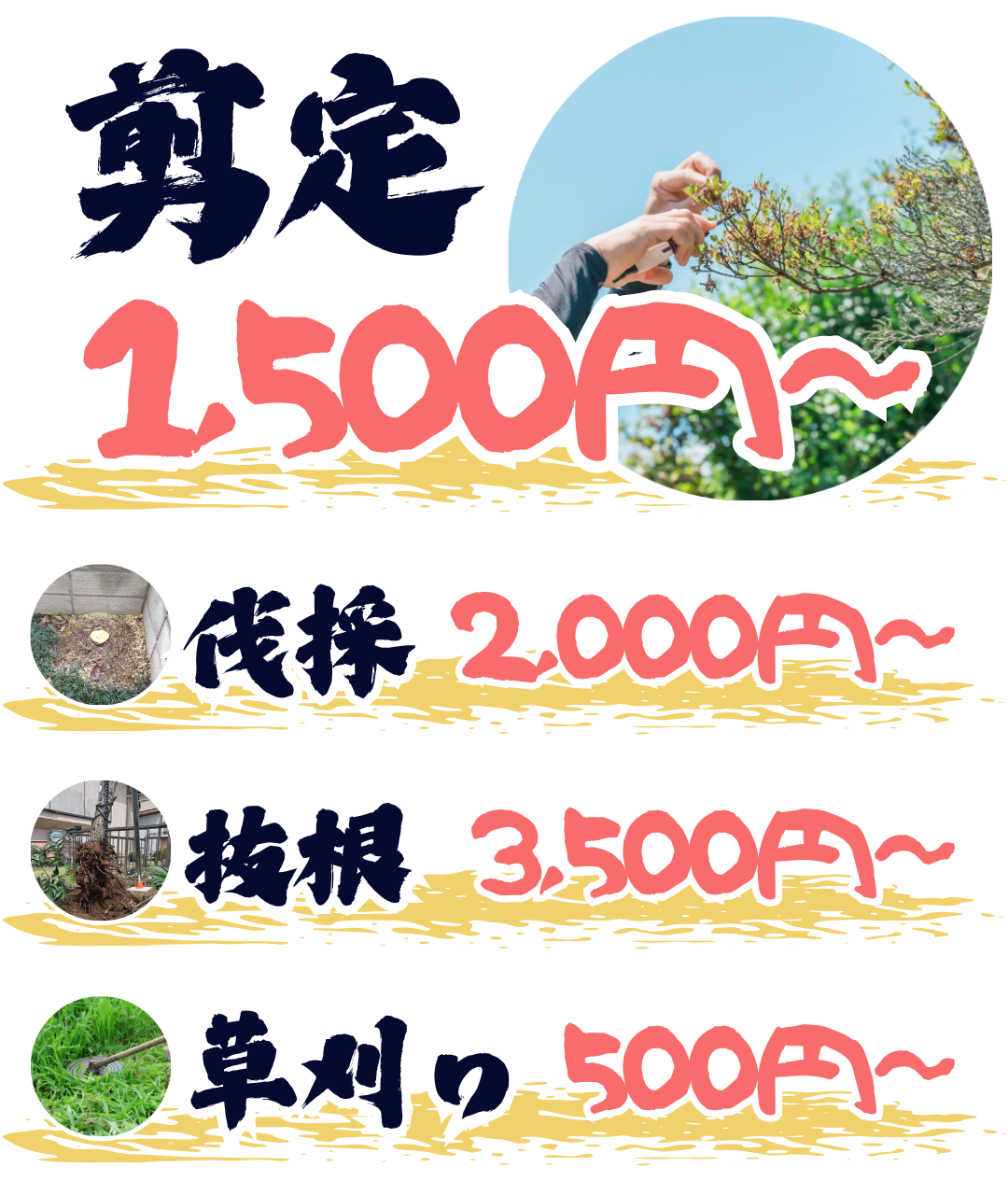 | 作業内容の幅 | ○剪定・伐採・草刈りまでトータルサポート。 | △剪定のみ・伐採不可など制限ある場合も。 | △基本メニューのみ。特殊作業は外注。 | ×軽作業中心。高所や難しい作業は不可。 |